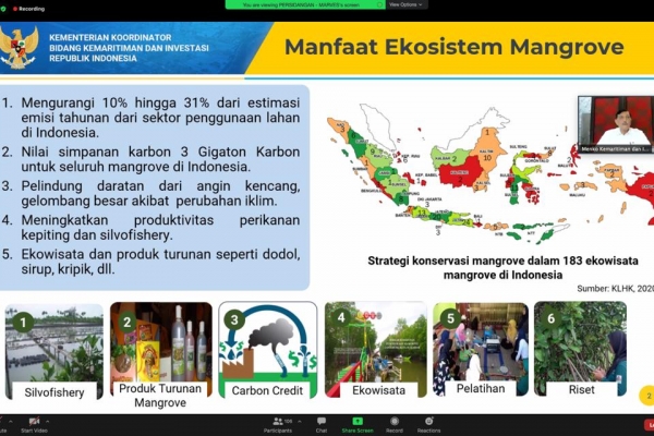 Menteri Koordinator Bidang Kemaritiman dan Investasi, Luhut Panjaitan, berharap sinergi pelaksanaan pemulihan ekosistem mangrove dapat berjalan dengan lancar. Termasuk Kemenparekraf dapat membangun jalur wisata alam mangrove dan mengembangkan model eco-tourism berbasis mangrove.